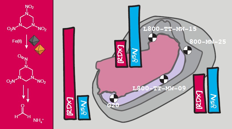 Strehlau, J.H., Berens, M.J, Arnold, W.A. 2018. Mineralogy and buffer identity effects on RDX kinetics and intermediates during reaction with natural and synthetic magnetite. Chemosphere, 213, 602-609.