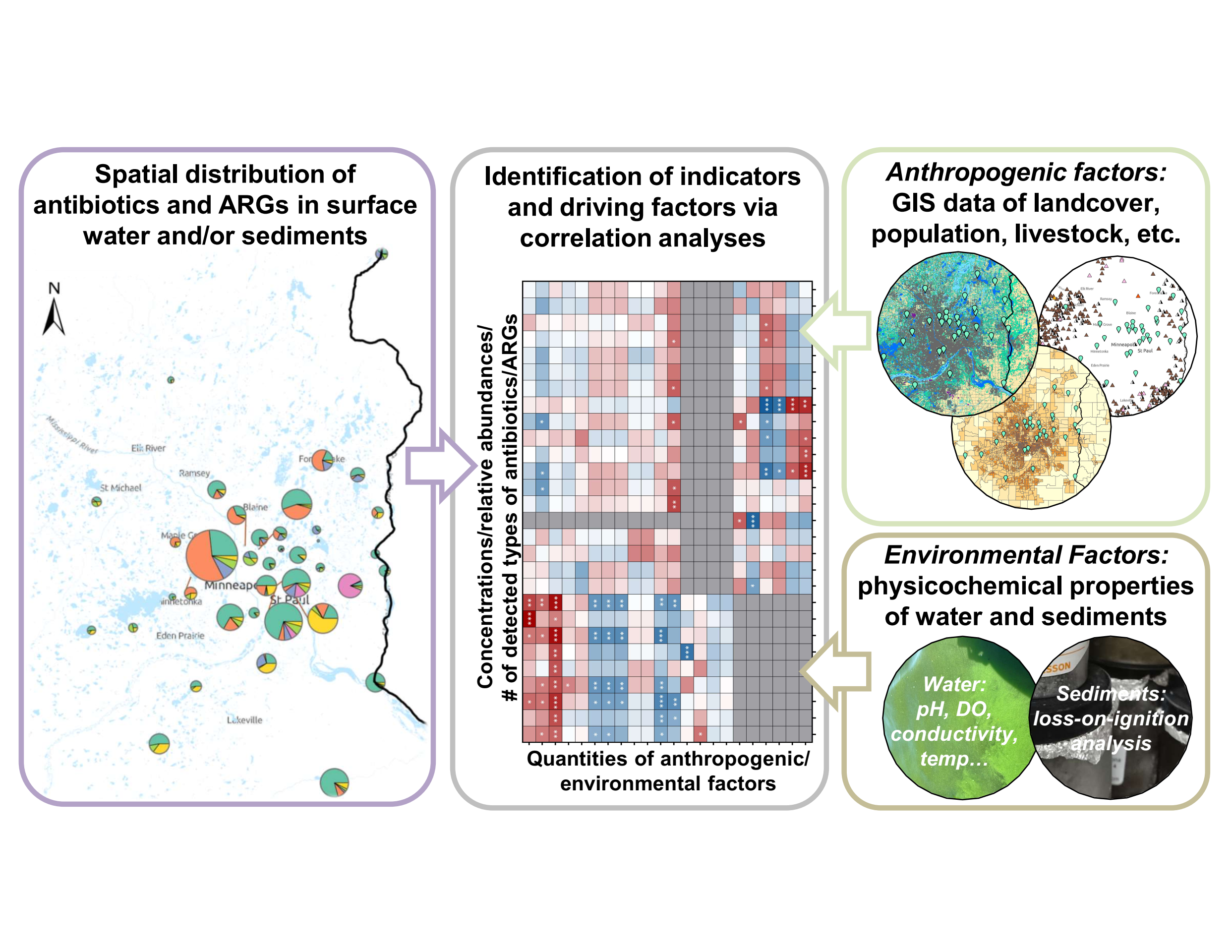 He, H.; Bueno, I.; Kim, T.; Wammer, K.H.; LaPara, T.M.; Singer, R.; Beaudoin, A.; Arnold, W A. 2023. Determination of the antibiotic and antibiotic-resistance footprint in surface water environments of a metropolitan area: Effects of anthropogenic activities. ACS ES&T Water, 3, 387–399. Open Access. Data set